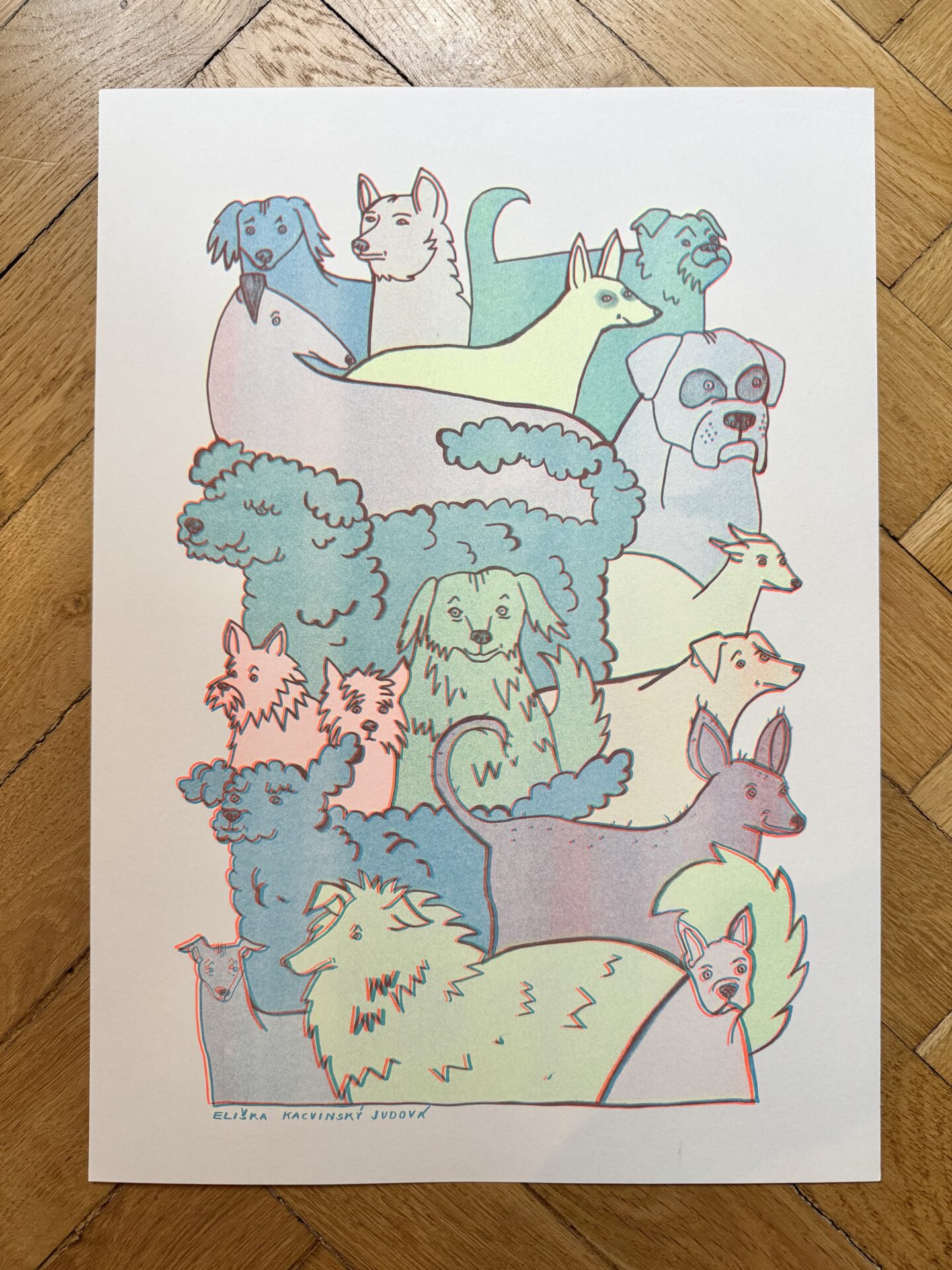 Tříbarevný riso tisk Hugovi psí kámoši.